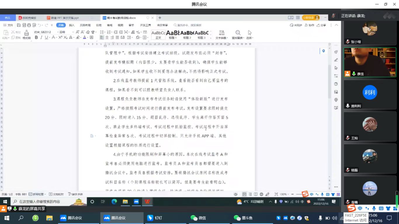 首先,薛龙根据学校期末考试工作的要求,结合《期末考试工作安排的通知》、《超星学习通考试系统操作手册员工端》、《超星学习通考试系统操作手册教师端》、《期末考试教师须知》等通知要求,对线上期末考试工作中的考核方式要求、考风考纪要求、考试过程管理、阅卷及材料存档、成绩登录等方面进行了详细解读和明确要求。