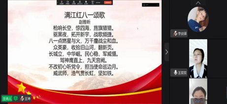 八月是军人的节日。8月2日晚佩洛西窜访台湾,解放军在台湾周边海域持续举行军事演习捍卫国家领土和主权完整,严厉打击了美国的狼子野心。宣传委员王双双带领大家共同学习了赵雅昕作所诗歌《满江红·八一颂歌》。通过豪情万丈的诗词让同学们了解到军人用生命来守护和平,为祖国勇敢献身的勇敢担当和使命职责。