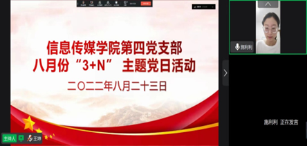 2022年8月23日晚太阳成集团tyc151cc第四党支部在钉钉网络平台开展“爱国担当·抗疫有我”主题党日活动。活动由第四党支部组织委员施利利主持,第四党支部的5名教师党员和45位员工党员参加活动。