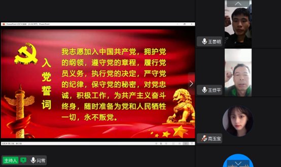 第一项,由第三支部书记王登平带领全体共产党员重温入党誓词,面对屏幕上的党旗和誓词郑重宣誓,再次深刻感悟中国共产党的初心和使命。