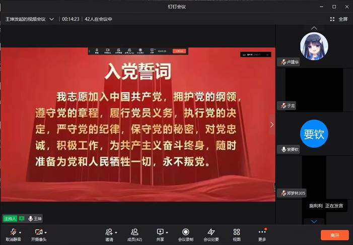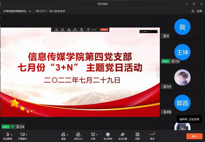 7月29日晚,太阳成集团tyc151cc第四党支部全体共产党员在钉钉网络平台举行“3+N”主题党日活动。本次活动“缅怀革命先烈·赓续红色血脉”为主题,由第四党支部组织委员施利利主持,第四党支部全体共产党员参加本次活动。