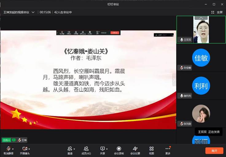 第三项议程,诵读红色经典。第四党支部宣传委员王双双带领全体共产党员诵读毛泽东主席在1935年创作的词《忆秦娥·娄山关》。此词描画了遵义会议后红军长征中征战娄山关的紧张激烈画面,表现了红军面对困难从容不迫的气度和坚信冲破阻碍取得胜利的壮阔胸怀。