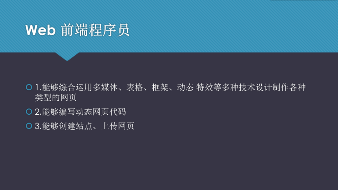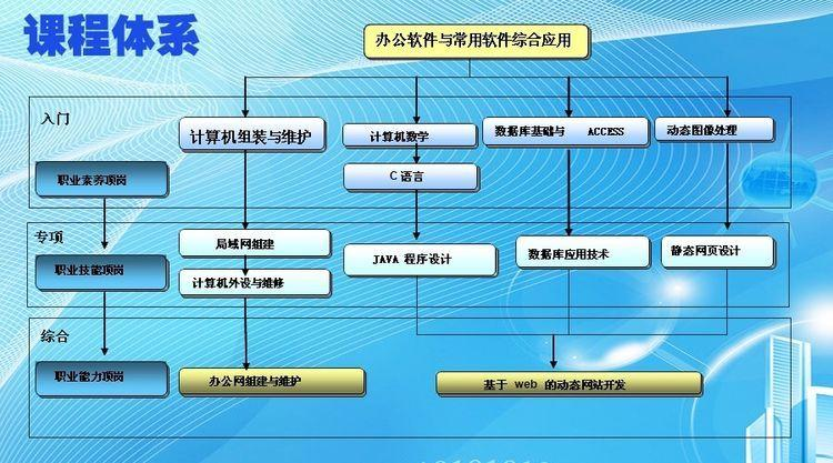 专业基础课:程序设计基础、图像处理、数据库应用技术、Pyhton 程序设计。 专业技能课:Web页面制作基础、高级程序设计、Html5开发及应用、JavaScript与jQuery交互 式前端开发、 Java Web应用开发、Web 前端初级实战、PHP程序计、Web前端综合实战。 专业拓展课:计算机组装与维护、网络基础、科技应用文写作。